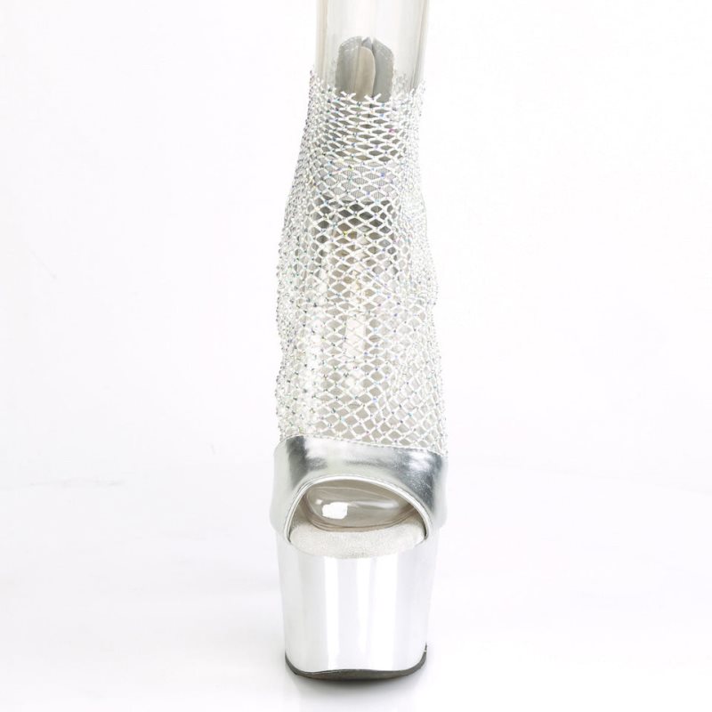 Make a striking impression with the Adore-765RM Sandal. This show-stopping piece features a 7-inch heel and a 2 3/4-inch platform, offering both height and style. The close back design is adorned with an eye-catching rhinestone mesh, adding a glittering element to your look. An elastic ankle band adds sophistication, and the back zip closure provides practicality. In shimmering silver, these sandals are ideal for special occasions or a night on the town. Let your sparkle shine with the Adore-765RM.