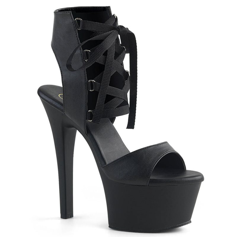 Step into sophistication with the Aspire-600-14 Sandal. Showcasing a stunning 6" heel and a 2 1/4" platform, these ankle-high sandals are crafted from sleek black vegan leather. The front lace-up design combines a daring look with adjustable wearability, adding a touch of elegance to your ensemble. Perfect for nights out or special occasions, the Aspire-600-14 offers both style and edginess in one exquisite package. Stand tall and confident with these show-stopping sandals.