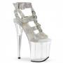 8" (200mm) Heel, 4" (100mm) Platform Rhinestone Embellished Strappy T-Strap Sandal Featuring Two Adjustable Buckle Straps, Cone Studs and Hardware Accents Going Up the Middle of the Shoe