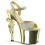 Step into the spotlight with the Revolver-709G, a standout ankle strap sandal that showcases a dazzling 7-inch rhinestone embellished gun heel. Complemented by a 3 1/4-inch platform, these gold sandals cultivate a bold and dramatic look. Ideal for those evenings where making a statement is not just a desire but a necessity, the Revolver-709G is here to complete your ensemble in spectacular fashion.