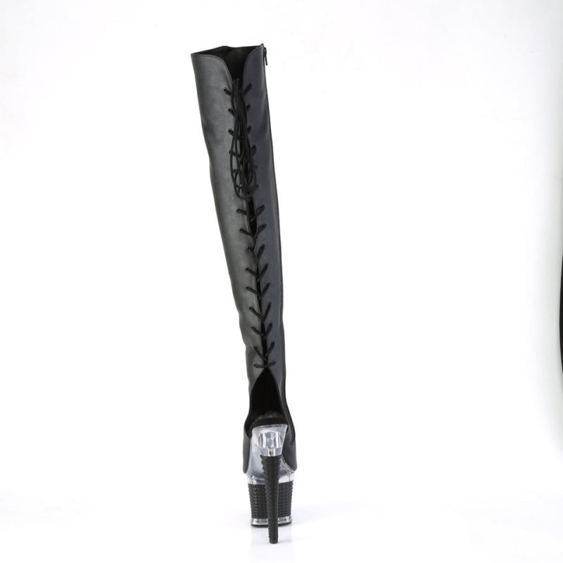 Unleash your inner diva with the Spectator-3019 Over-The-Knee Boots. Featuring a dramatic 7" heel and a 3" textured platform, these boots are designed to mesmerize. The open toe and heel give a daring edge, complemented by the striking chrome plated platform bottom and captivating lace-up back detail. These boots come in a classic black vegan leather with clear accents, making them a fierce addition to your footwear collection. The full-length inside zip closure adds an element of practicality to an already jaw-dropping design.